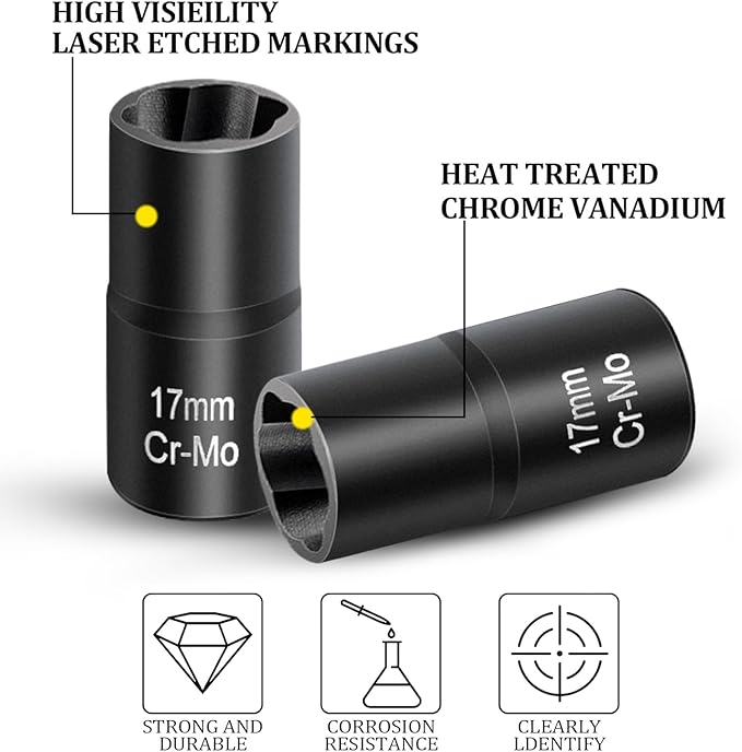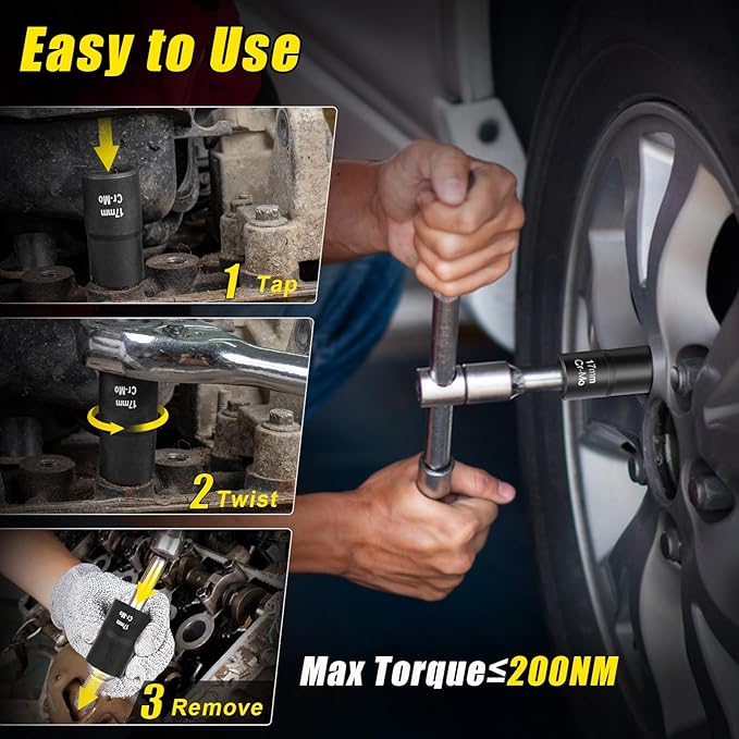 - Reverse twist socket offers max torque, making it easy to remove stripped, rusted, rounded, and damaged bolt and lug nuts