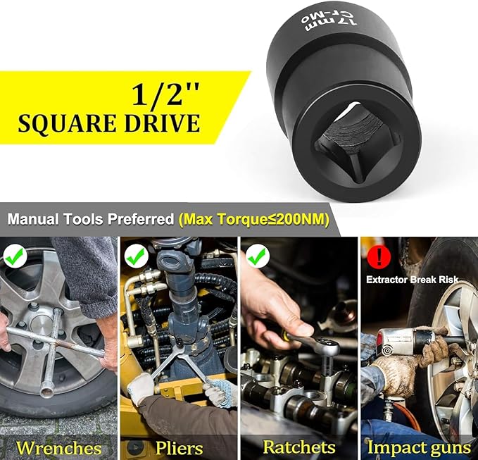 - Standard 1/2-inch drive square head works with ratchets, breaker bars and more hand tools (Max Tool Torque ≤ 200NM)