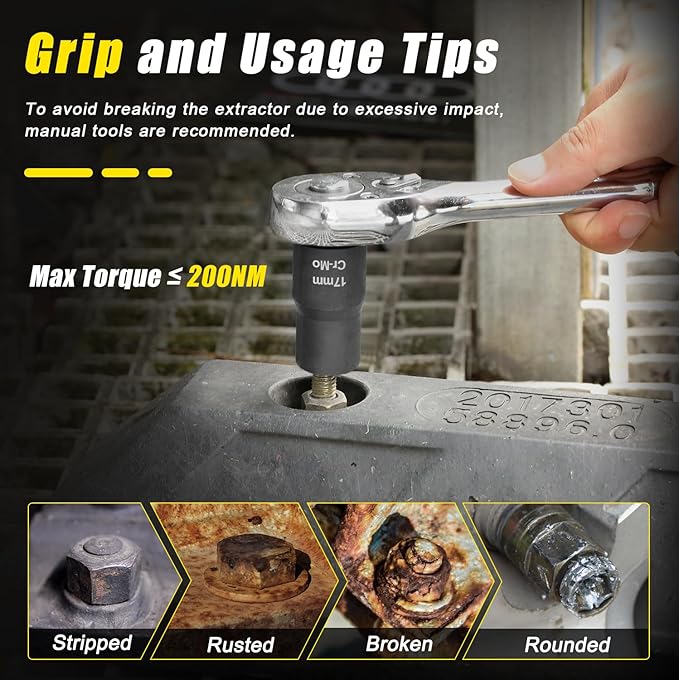 - Use only with standard hand tools (≤200 Nm). High-torque or impact tools can exceed this limit and break the extractor