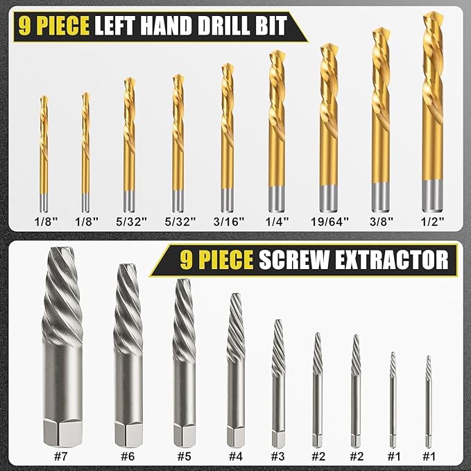 - Ultimate Extraction Solution: Tackle broken or damaged screws, bolts, and fasteners with ease using our 18-piece screw extractor and left hand drill bit set. This comprehensive set includes 9 screw extractors and 9 left hand drill bits, providing you with the tools you need to handle a wide range of extraction tasks.