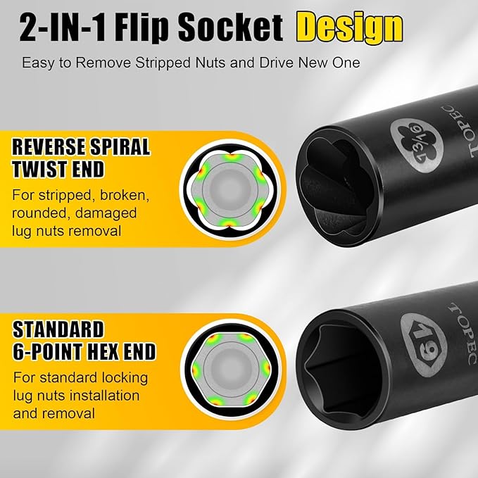 - 【Standard Hex End】The 6-point end ensures a secure grip when installing or removing stripped lug nuts, effectively preventing fasteners from becoming rounded.