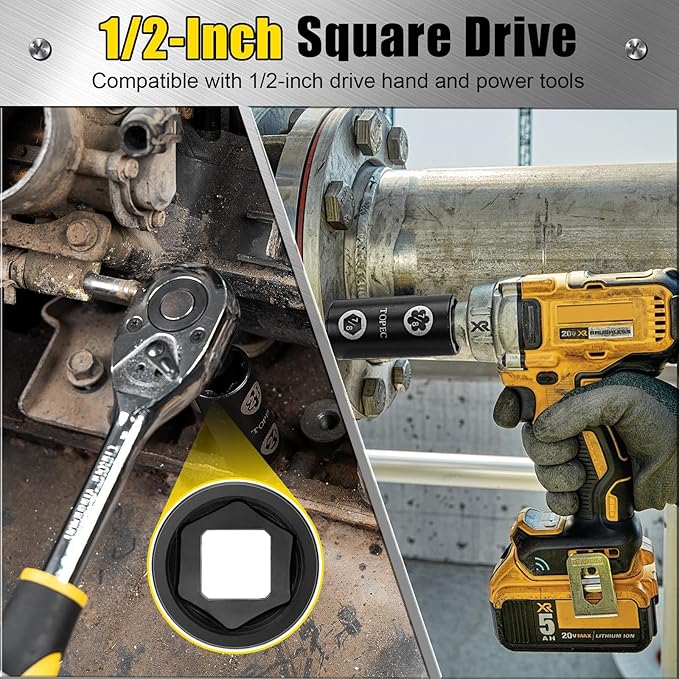 - 【2-in-1 Dual-End Design】Includes 5 flip sockets and a 1/2-inch drive hex adapters and a extractor bar. Sizes include: 17mm, 19mm, 13/16 inch, 21mm, and 7/8 inch (22mm). Ensures compatibility with various vehicles and maintenance tasks.