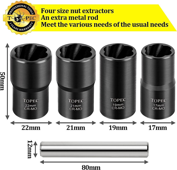 - 🔧<b>MULTI-APPLICATION-</b> 17MM, 19MM, 21MM and 22MM four different size nut extractors and an extra metal rod can meet the various needs of the usual needs, whether it is car repair, home decoration, or craft production, can provide you with Great convenience.